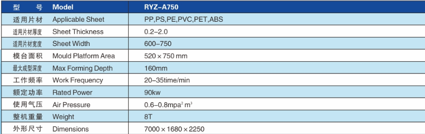 RYZ-750系列全自動液壓制杯機(jī)是我司開發(fā)研制的高速度,高效率的全自動塑料容器的成型機(jī)。該機(jī)適用于生產(chǎn)PS,PP,PVC,PET,ABS等塑料片材